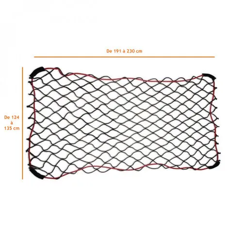 Le filet de remorque élastique mesure 124 cm en longueur par 191 cm de largeur minimum et peut aller jusqu’à 135 cm de longueur par 230 cm de largeur. Ce filet de remorque élastique s’adapte ainsi à votre chargement.