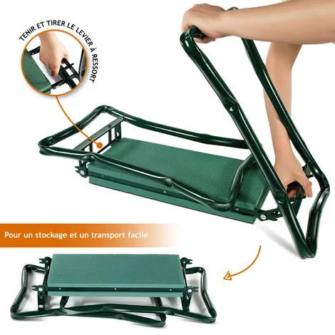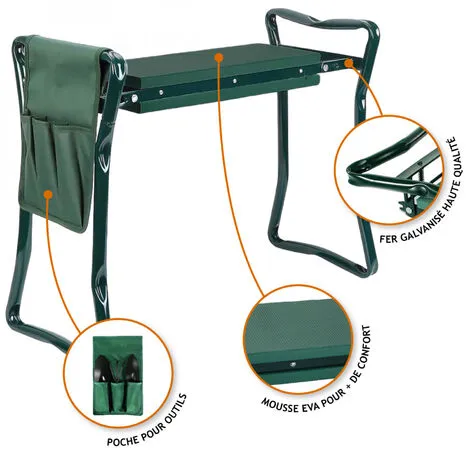 Pratique, avec des rampes latérales facilitant la descente et la remontée du tabouret, il dispose également d’une poche de rangement en tissu oxford, idéale pour y placer les outils de jardinage, tout est à portée de main.